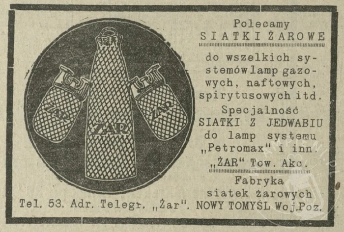 | produkowane części do lamp | siatki żarowe do wszelkich systemów lamp gazowych, naftowych, spirytusowych itd. Specjalność: siatki żarowe do lamp systemu „Petromax” |